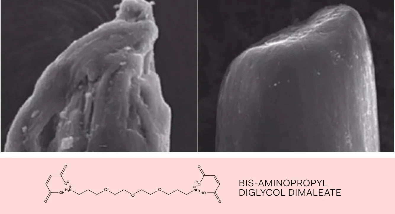 El bis-aminopropyl diglycol dimaleate, una molécula simple, actúa de una forma única para reparar rápida y eficazmente los enlaces rotos y restaurar la salud del cabello.